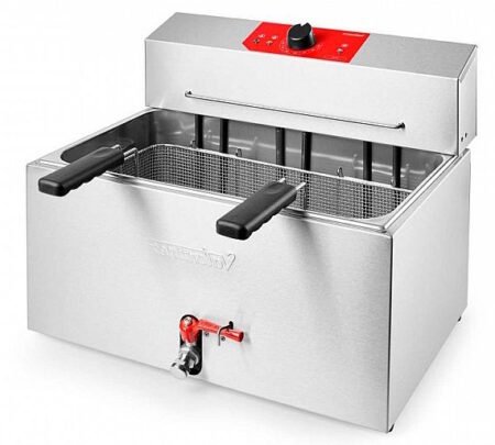 Totalmente construida en acero inox. Cuba embutida en una pieza, sin soldaduras, con ángulos redondeados. Con grifo de vaciado. Chasis y cuba desmontables para facilitar la limpieza. Diálogo sistema para un rendimiento máximo. Termostato de seguridad con botón de rearme. Modelo encastrable bajo pedido (mismo precio). Dimensiones: 560x415x265-420 mm. Dimensiones cesta: 500x235x108 mm (Opcion: 2 x 220x235x108). Capacidad cuba: 12,50/14 Litros. Potencia: 6,90 Kw. Voltaje: 3x400V. Producción: 14 Kg/h